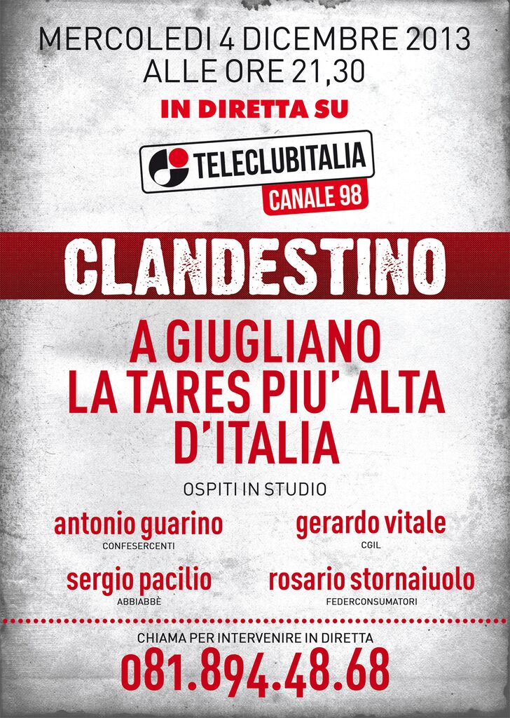 Stanno per arrivare le bollette della Tares a Giugliano che quest’anno è la regina d’Italia. I residenti pagheranno la cartella più alta della nazione e proprio per questo la nostra redazione ha deciso di dedicare una puntata speciale del nostro clandestino al problema. Una puntata speciale perché potranno intervenire anche i cittadini telefonicamente allo 0818944868 per dire la loro e per fare domande ai nostri ospiti. In studio con Cristina Liguori ci sarà Emanuele Carandente dell’ordine dei dottori commercialisti, Gerardo Vitale della CGIL, Rosario Stornaiuolo della Federconsumantori e Antonio Guarino della Confesercenti. Bollette salate e mancati servizi questi i temi caldi ma anche evasione e un punto della situazione sugli altri comuni. L’appuntamento come sempre per la diretta è per questa sera alle 21.30. Sintonizzatevi.