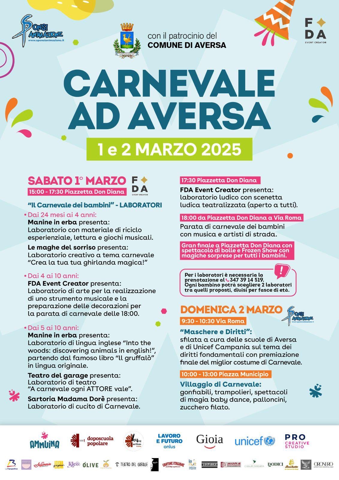 Aversa si prepara a vivere un Carnevale all’insegna della creatività, dell’inclusione e del divertimento. L’1 e il 2 marzo 2025 il cuore della città si trasformerà in un grande spazio di festa con laboratori, spettacoli, parate e momenti di aggregazione per tutte le età. L’evento, patrocinato dal Comune di Aversa e organizzato dall’associazione giovanile “Ammuina” in collaborazione con FDA Event Creator, Sponsi Animazione e numerose realtà locali, vedrà anche la partecipazione dei bambini del doposcuola popolare della Caritas di Aversa, che prenderanno parte alle attività per vivere insieme la gioia di questa festa.