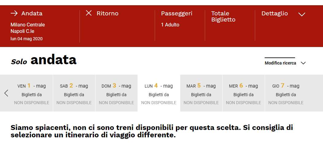 Treni per Napoli da Milano tutti esauriti dal 4 maggio. Basta dare uno sguardo ai siti di prenotazione dei viaggi o all’app di Trenitalia e provare a comprare un biglietto su un Frecciarossa Milano-Napoli. Tutto esaurito. Non c’è un posto libero dal 4 maggio per tutta la settimana. La segnalazione arriva direttamente dal consigliere Borrelli: Un cittadino ci segnala che nelle date del 4, 5 maggio e giorni successivi i posti dei treni provenienti da Milano e diretti a Napoli non sono acquistabili. Ci si prepara ad un’altra invasione dalla Lombardia?
