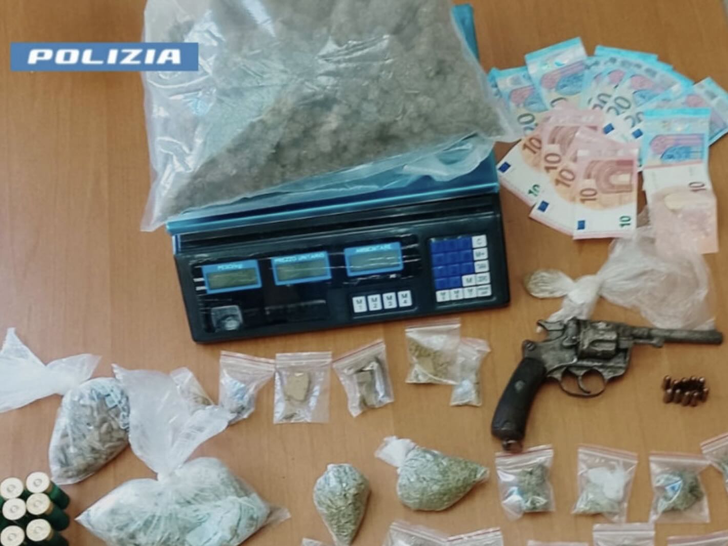 Durante la perquisizione, i poliziotti hanno rinvenuto, nascosti in una scarpiera e in un locale nella disponibilità dell’indagato, una pistola revolver con matricola abrasa e 33 cartucce di vario calibro. Oltre alle armi, gli agenti hanno sequestrato oltre un chilo di sostanze stupefacenti, tra cui più di mezzo chilo di marijuana in busta, 99 involucri della stessa droga, due dosi di cocaina, oltre a 315 euro in contanti, bilancini di precisione, una macchina per il sottovuoto e altro materiale per il confezionamento.